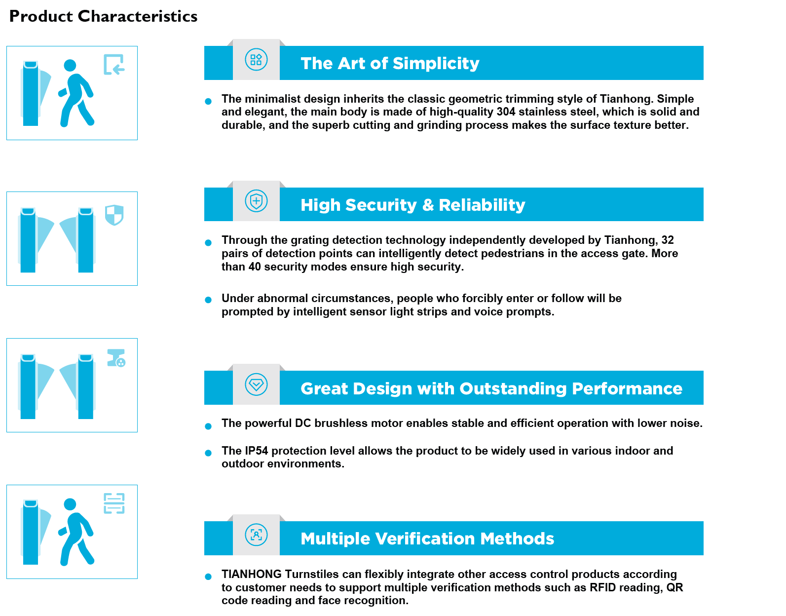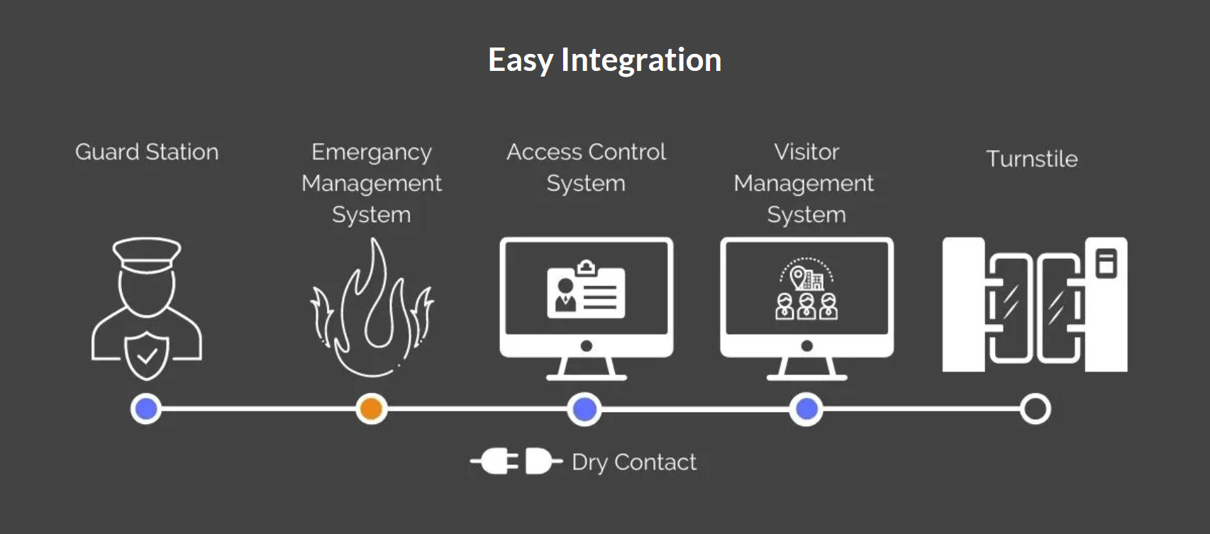 The flap barrier biometric turnstile comes with a standard electric interface that can easily integrate the common 3rd party access control system, such as bar-code scanner, Token coin collector, time & attendance system, card collector, biometric systems (fingerprint & face recognition), ESD system and fare collection system, etc. It’s one of the most common security turnstiles.