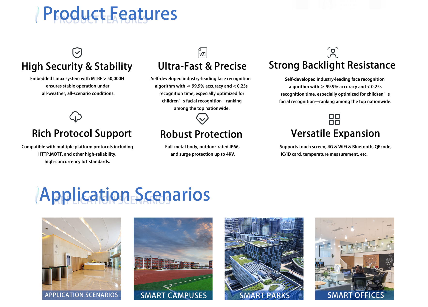 It integrates with third-party systems (e.g., elevators, turnstiles) via Wiegand, RS485, and TCP/IP. Additional features include temperature detection, IP65 weatherproofing, and optional 4G/Wi-Fi.