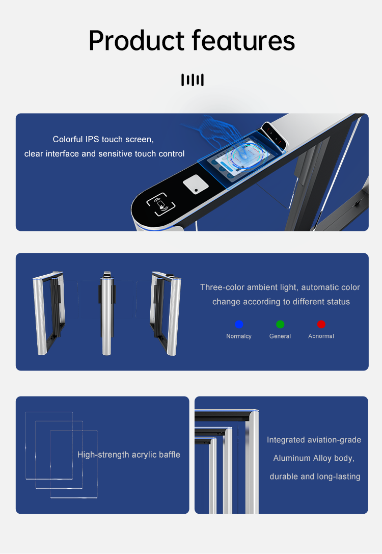 The SG478, developed by Zhonghai Tianhong, is a next-generation, ultra-slim speed gate engineered for high-security and high-traffic environments. It integrates three distinct authentication modalities—palm vein recognition, facial recognition, and RFID card reading—into a single, elegant, and compact unit. This advanced integration represents the forefront of access control technology.